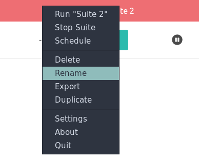 The context menu can be accessed by right-clicking in a suite tab. This menu has several context-specific actions for suites.
